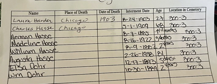 Laura Gohr died in 1893 of puerpural fever. A baby daughter, Elsa, had died five days earlier. Laura, another infant William, and Elsa were buried at Concordia Cemetery with the Hasse family. Wilhelm Gohr died in Chicago in 1905 and was buried at Bethania Cemetery with his daughter Anna Glawe and her family.
