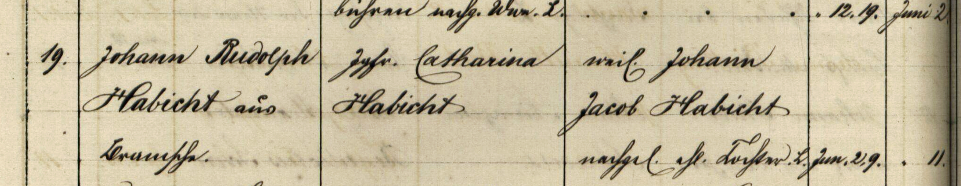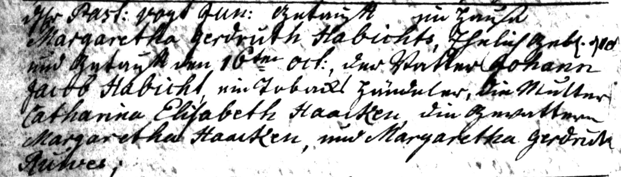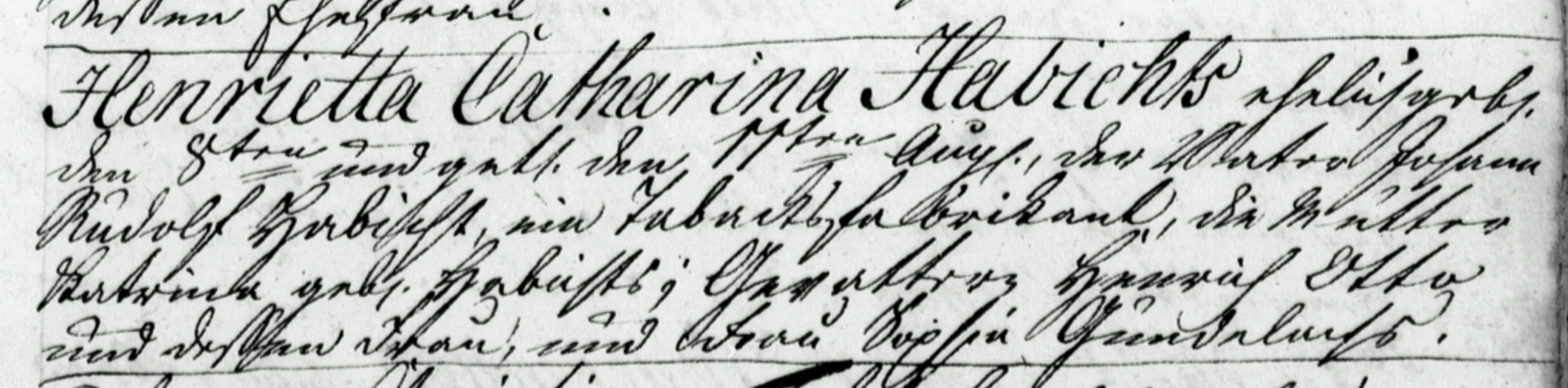 Catharina Habicht was the daughter of Johann Jacob Habicht (perhaps an older brother or uncle of Johann Rudolph?) and Catharina Elisabeth Haacken and had at least two sisters, Sophia Eleanora Margaretha Habicht, born in 1761 (later married to Johann Justus Gundelach), and Margaretha Gerdruth, born in 1763. Their presumably older sister Catharina (baptism record not yet found) had twelve children with her husband Johann Rudolph Habicht, and Henriette was the last child of this couple, who died in 1796.